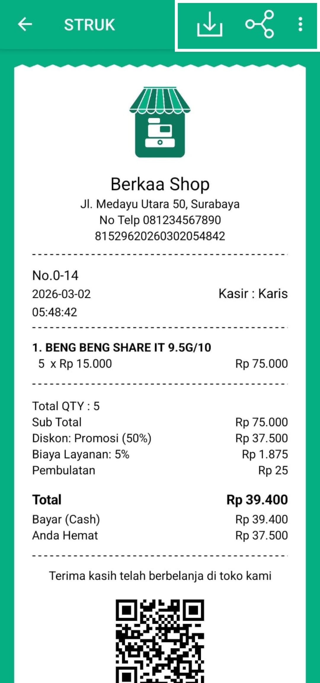 - Bagikan: Membagikan struk kepada pelanggan atau pihak terkait.