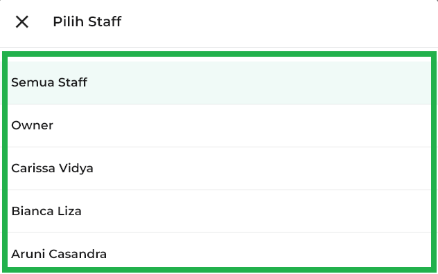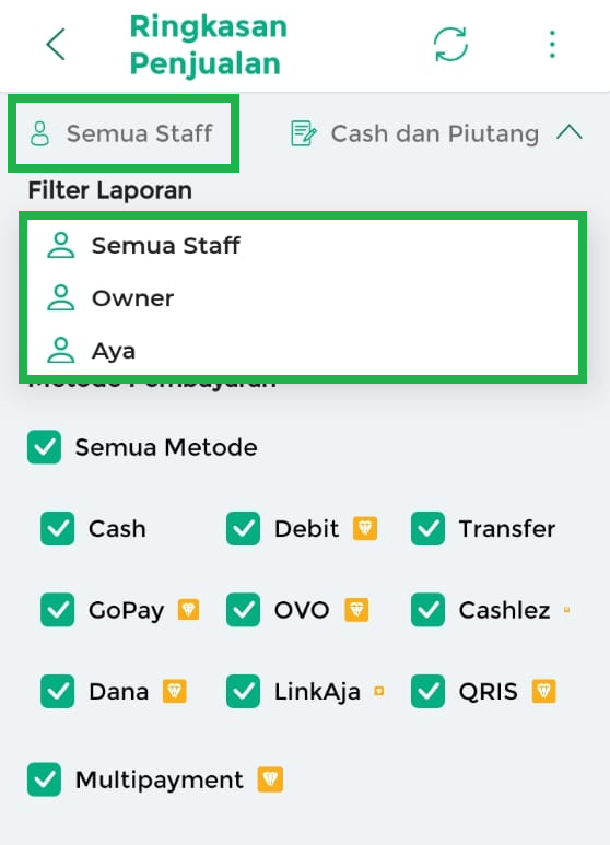 Pilih filter untuk melihat Ringkasan Penjualan dari Semua Staf, Hanya Owner, atau Staf Pilihan.