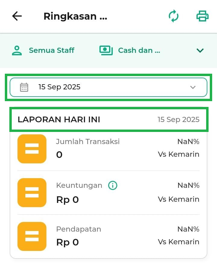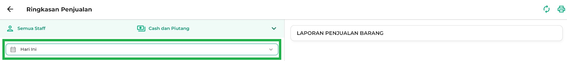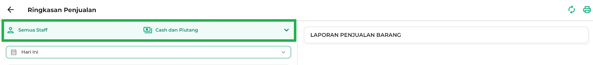 - Staf Pilihan: Menampilkan ringkasan penjualan dari staf tertentu sesuai yang Anda pilih.