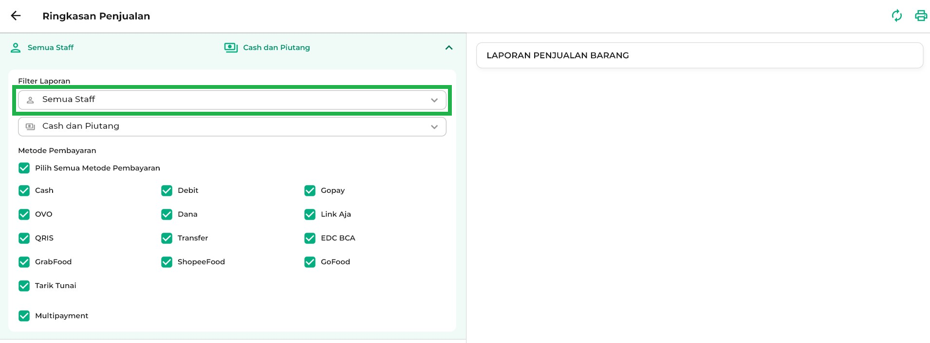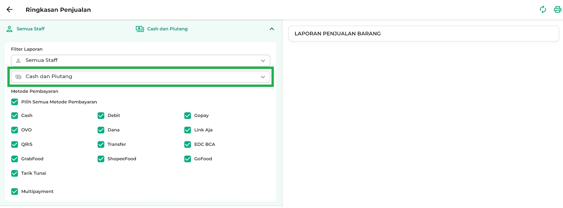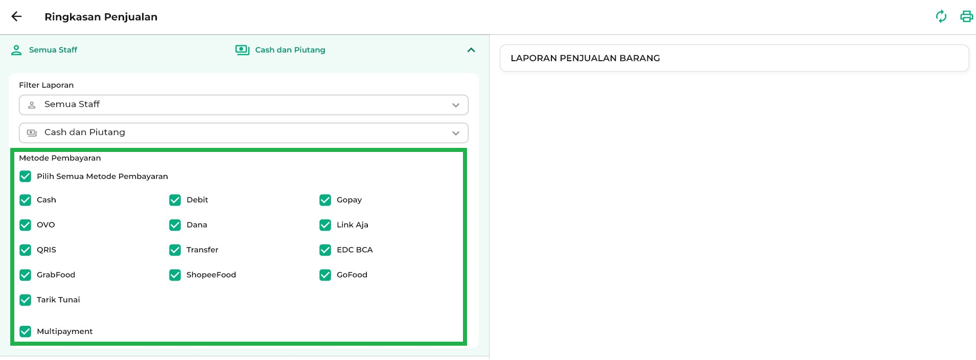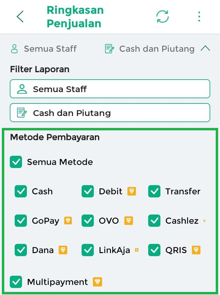 Pada Ringkasan Penjualan, Anda dapat memilih metode pembayaran yang ingin ditampilkan. Jika memilih Semua Metode, maka seluruh metode pembayaran akan muncul. Anda juga bisa mencentang metode pembayaran tertentu, misalnya cash dan ovo, agar laporan lebih sesuai dengan kebutuhan bisnis Anda.