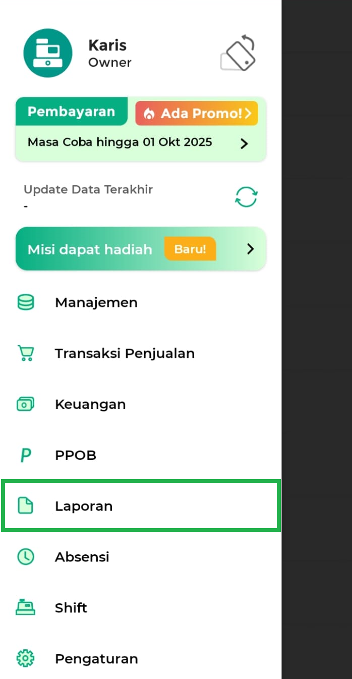1. Buka aplikasi Kasir Pintar Pro dan klik ikon garis tiga di pojok kiri atas untuk membuka menu sidebar.