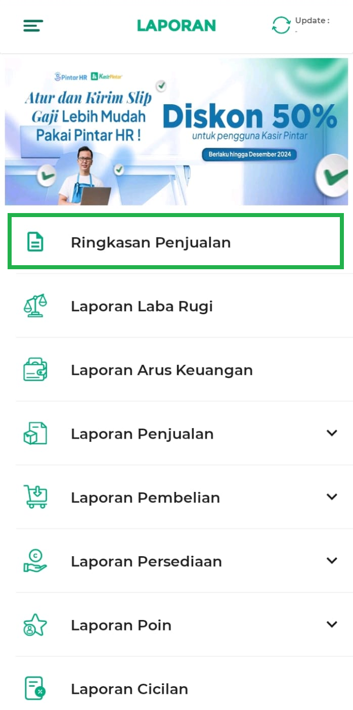 Kelola bisnis jadi lebih gampang dengan Ringkasan Laporan Penjualan di Kasir Pintar. Semua data transaksi, keuntungan, hingga modal tersisa tercatat otomatis, sehingga kamu bisa fokus mengembangkan usaha tanpa ribet hitung manual. Berikut penjelasan penggunaan Ringkasan Laporan Penjualan berdasarkan aplikasi Kasir Pintar yang Anda gunakan.