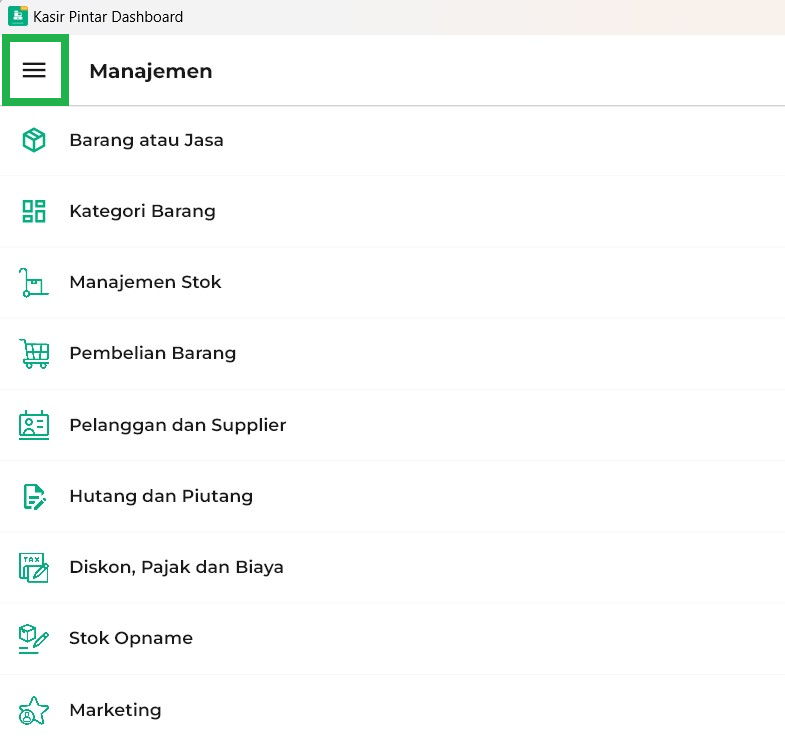 1. Buka aplikasi Kasir Pintar Dashboard dan klik ikon garis tiga di pojok kiri atas untuk membuka menu sidebar.