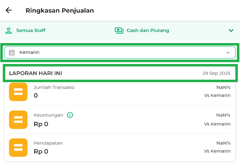 - Semua Staf: Menampilkan ringkasan penjualan dari seluruh staf yang mencatat transaksi penjualan.