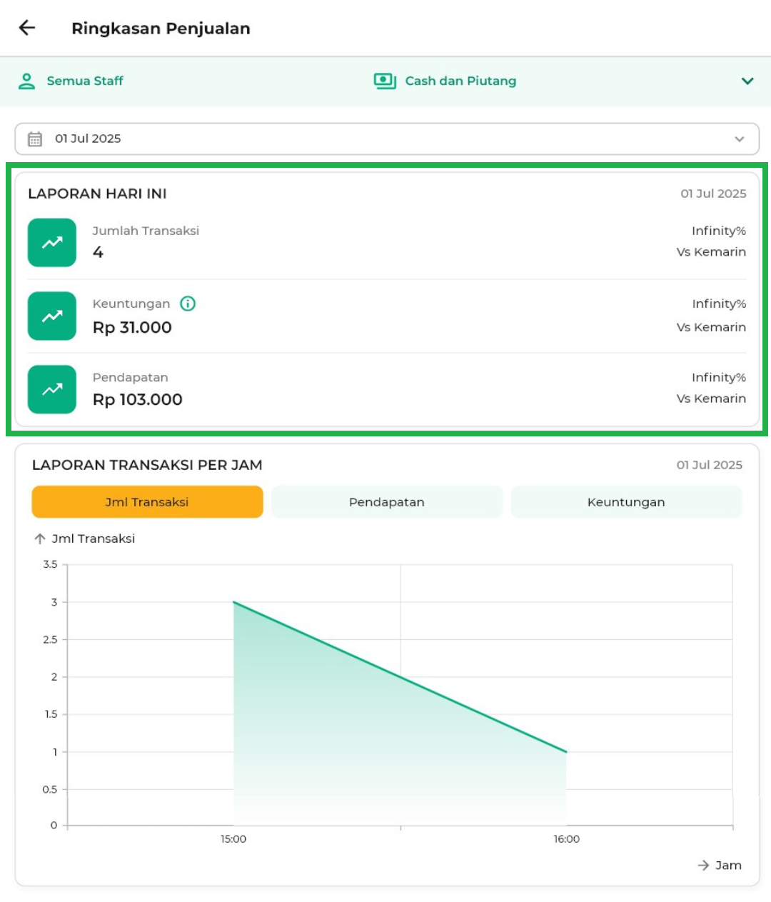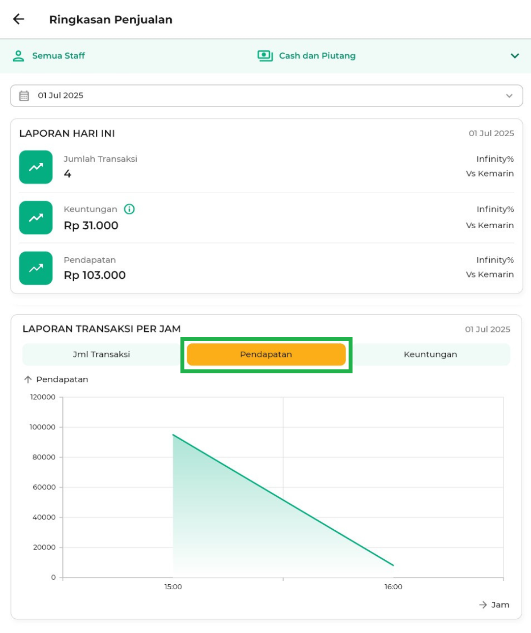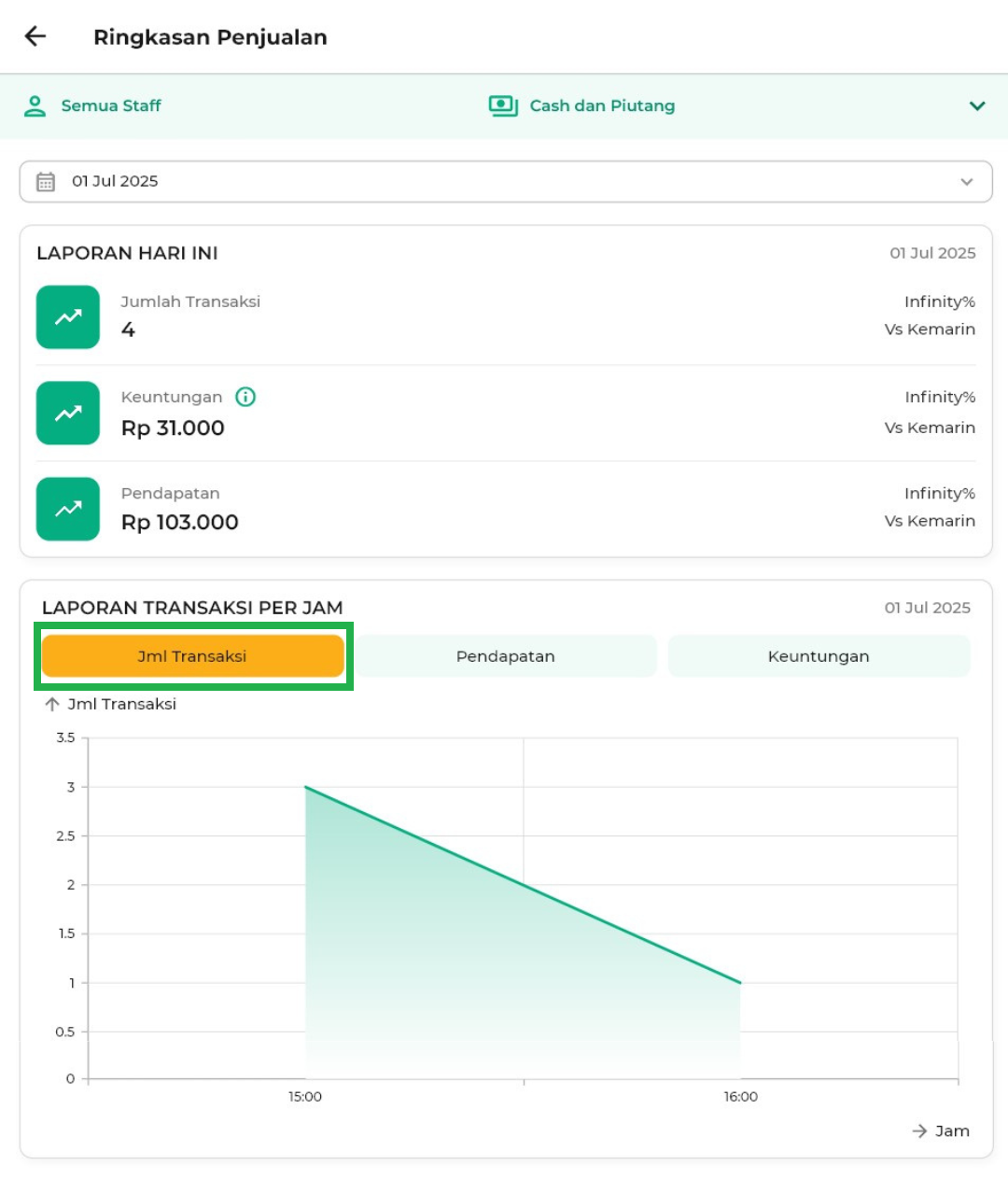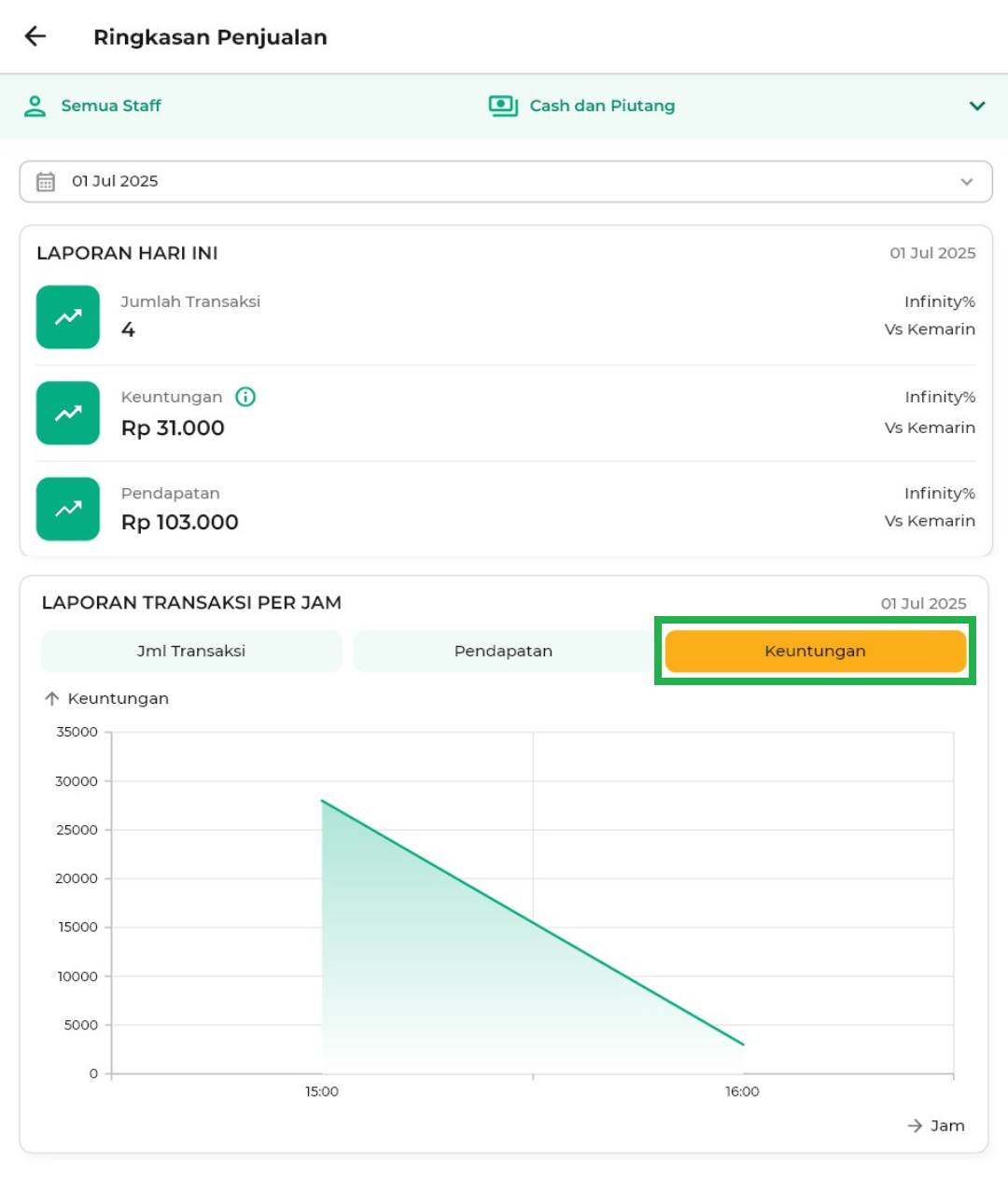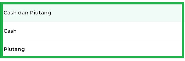 - Cash dan Piutang: Menampilkan semua transaksi, baik yang dibayar tunai maupun masih piutang.