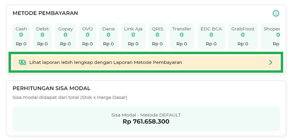 8. Anda juga dapat melihat Ringkasan Penjualan berdasarkan Metode Pembayaran. Untuk detail lebih lanjut, klik Lihat Laporan Metode Pembayaran Lebih Lengkap.