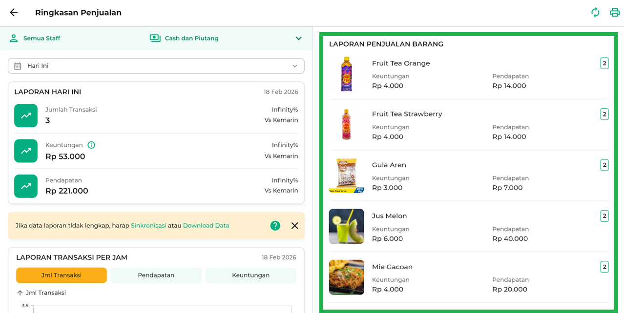 - Owner: Menampilkan ringkasan penjualan khusus transaksi yang dilakukan oleh akun Owner saja.