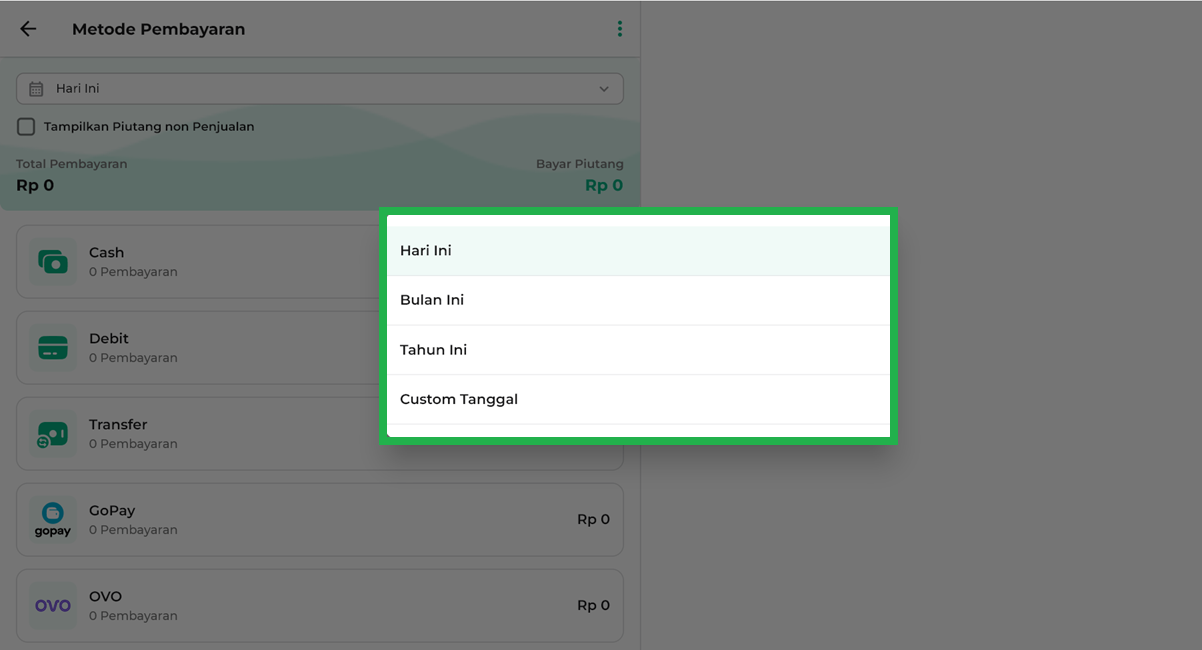 Untuk memudahkan analisis, Anda bisa memilih periode waktu pada Laporan Metode Pembayaran. Tersedia tiga opsi periode yang bisa disesuaikan dengan kebutuhan Anda: