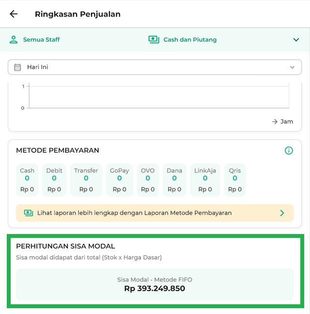 9. Pantau sisa modal dengan mudah. Nilai ini dihitung dari total stok barang dikalikan harga dasar sesuai metode pengaturan stok yang Anda gunakan (misalnya Metode FIFO, LIFO, Average, atau Default). Dengan begitu, Anda bisa mengetahui modal yang masih tersedia untuk operasional.